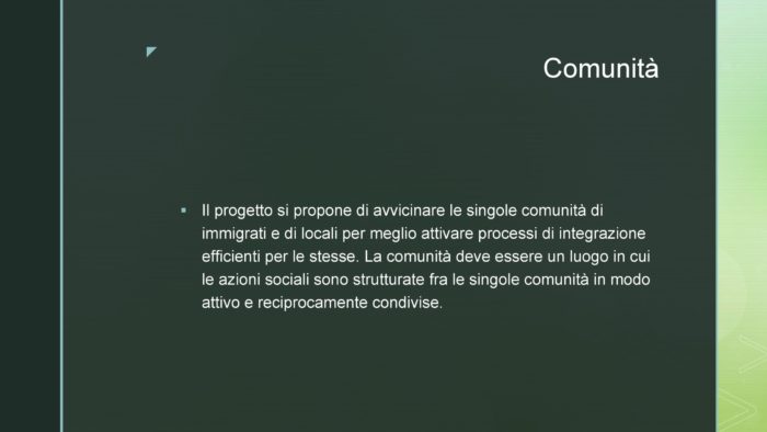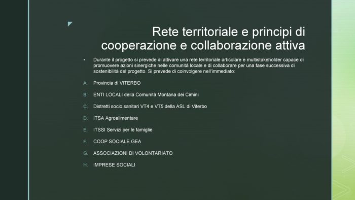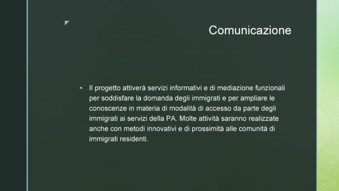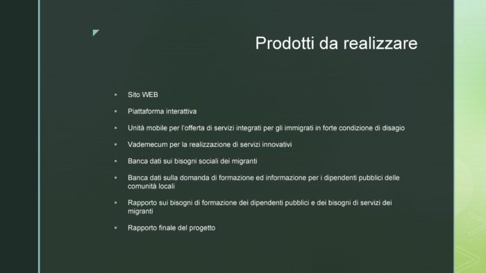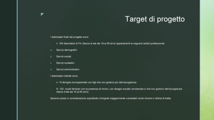 Migliorare l’offerta dei servizi amministrativi dell’ente locale specifico del territorio della Comunità Montana dei Cimini, dei servizi scolastici fortemente personalizzati, del servizio di mediazione culturale in modo da facilitare e comprendere meglio le specificità della domanda di servizi provenienti dai migranti e dei servizi sanitari per l’utenza finale del progetto. Il progetto vuole attivare un dialogo sociale attivo fra le rispettive comunità locali (immigrati residenti e residenti indigeni) con la possibilità di far accedere tutti ai servizi sociali presenti nel territorio ed erogato dall’Ente Pubblico specifico. L’obiettivo del progetto è di riuscire ad offrire i singoli servizi con competenza e con una adeguata informazione funzionale al processo di integrazione degli immigrati e delle loro famiglie. Nella gestione dei servizi informativi per gli immigrati si terranno presente due fattori importanti e cioè quello culturale e quello dei tempi della gestione dei servizi. Il fattore culturale fra le comunità sarà superato con servizi di mediazione linguistica e culturale in grado di facilitare il dialogo fra il soggetto erogatore del servizio e l’immigrato; il fattore tempo sarà superato con la gestione di un modello innovativo di erogazione del servizio basato sulla gestione di una rete informatizzata dei servizi. I servizi inoltre soprattutto quello scolastico saranno personalizzati con un accompagnamento attivo.